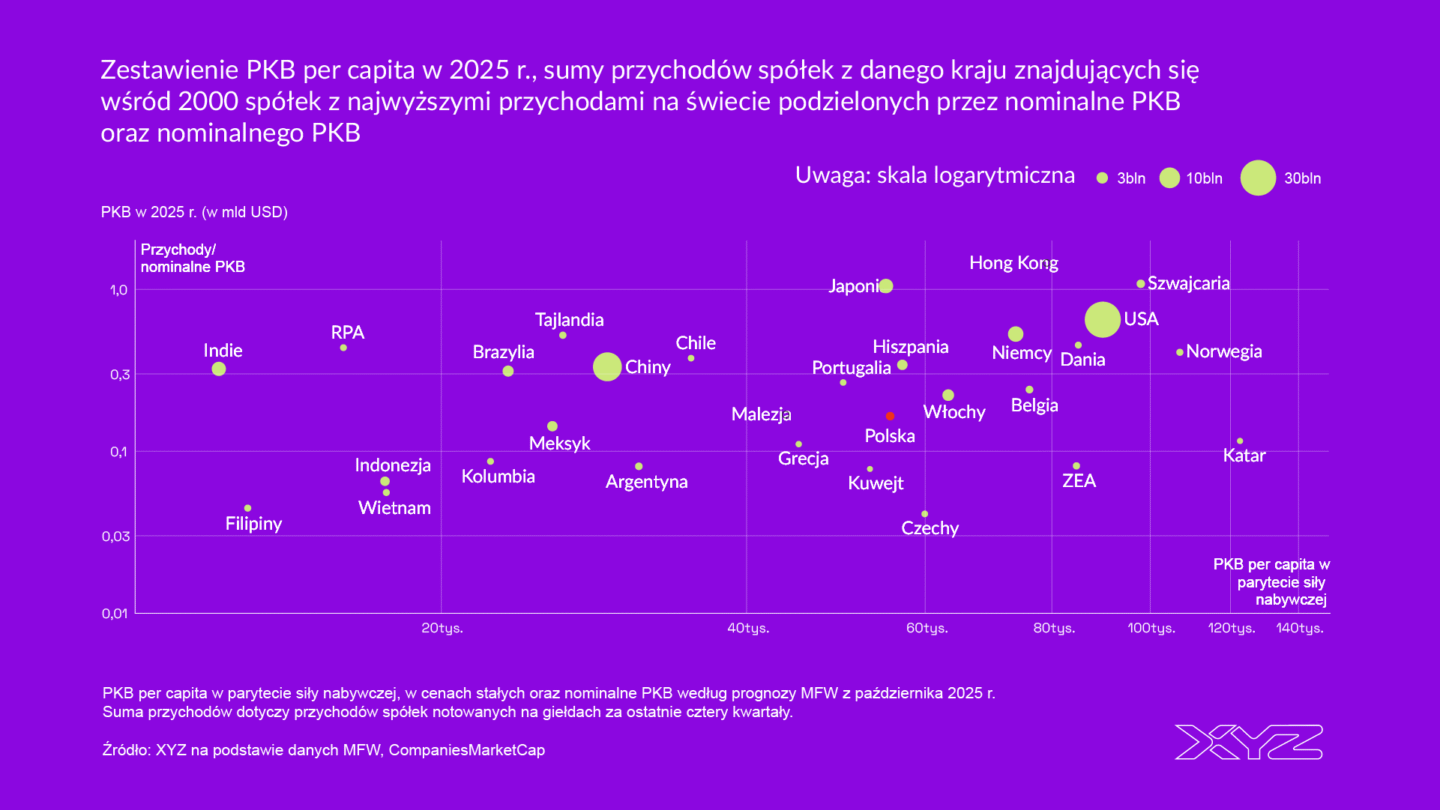 Jeśli wartość wskaźnika wynosi 0,5, oznacza to, że przychody spółek z globalnego top 2000 z danego kraju są równe połowie jego PKB. Taka konstrukcja eliminuje zniekształcenia wynikające z wielkości rynku wewnętrznego – duże gospodarki naturalnie mają większe firmy, dlatego analiza oparta na relacji przychodów do PKB pozwala porównać kraje na bardziej wyrównanych zasadach.