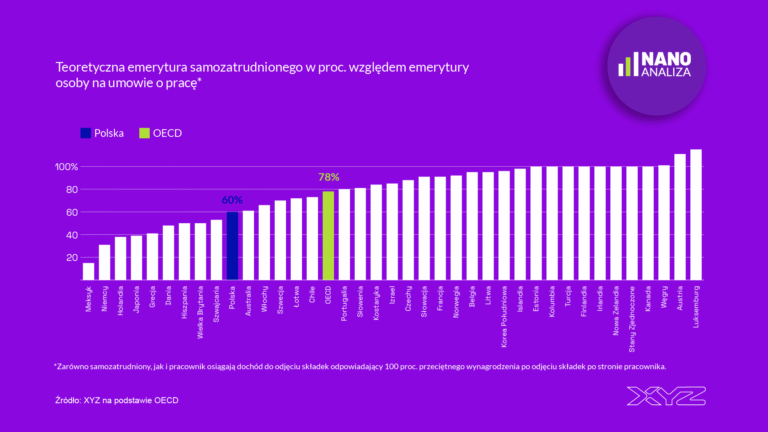 Emerytury osób samozatrudnionych w krajach OECD są wyraźnie zróżnicowane i w dużym stopniu zależą od konstrukcji systemu składkowego. Najnowsze dane pokazują, że w Polsce – mimo relatywnie wysokiego udziału samozatrudnionych na rynku pracy – relacja ich przyszłych świadczeń do emerytur pracowniczych będzie jedną z najniższych. Dla zdecydowanej większości samozatrudnionych w Polsce realnym scenariuszem na starość pozostaje emerytura minimalna.