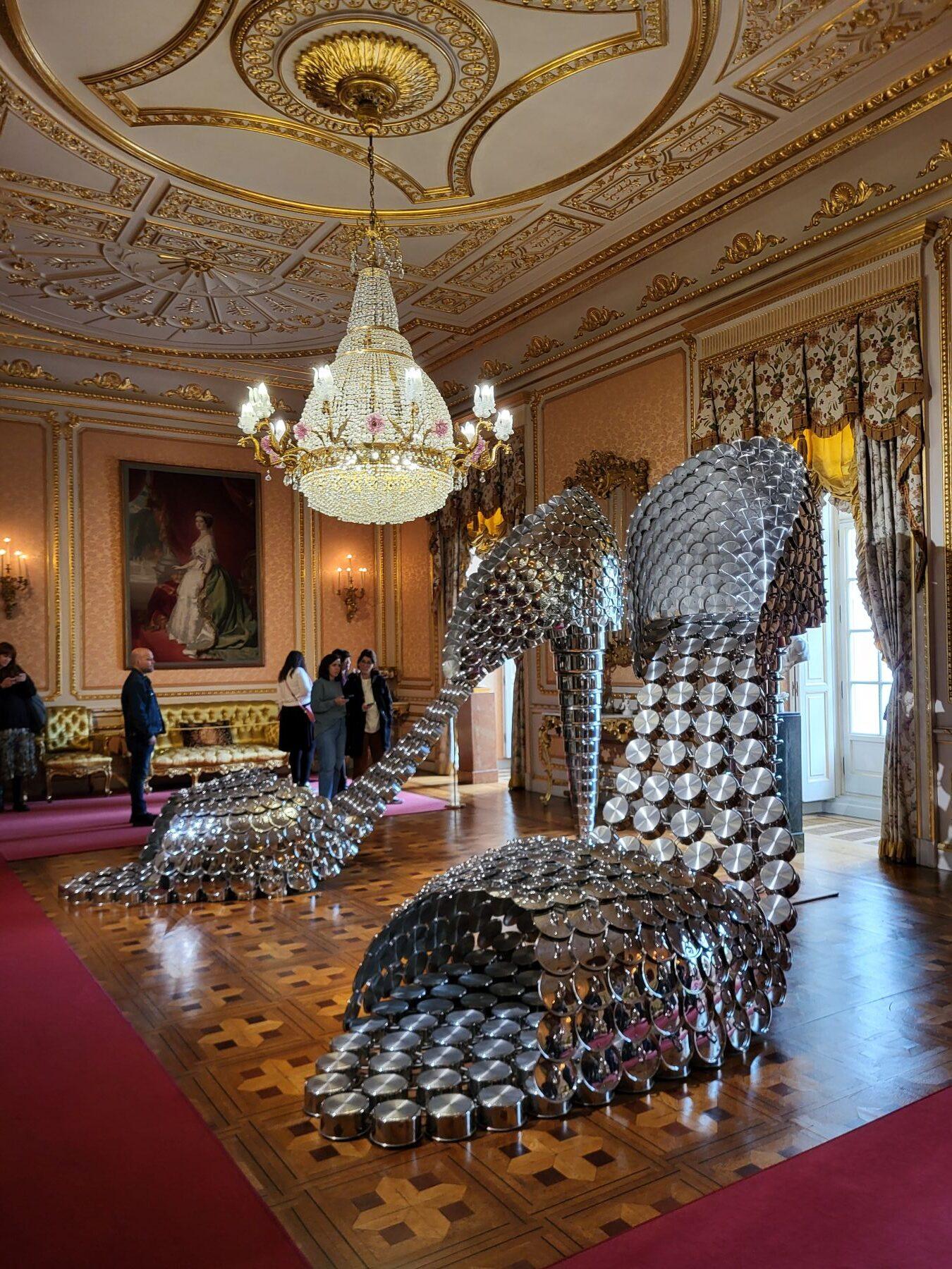 Szczególnie uderzające są prace takie jak "Coração Independente Preto", czarne serce zawieszone w Salonie Hiszpańskim, wykonane ze sztućców, czy "J’Adore Miss Dior", ogromna kokarda stworzona z flakonów perfum słynnej marki modowej, która zdobi Salę Zuloaga.