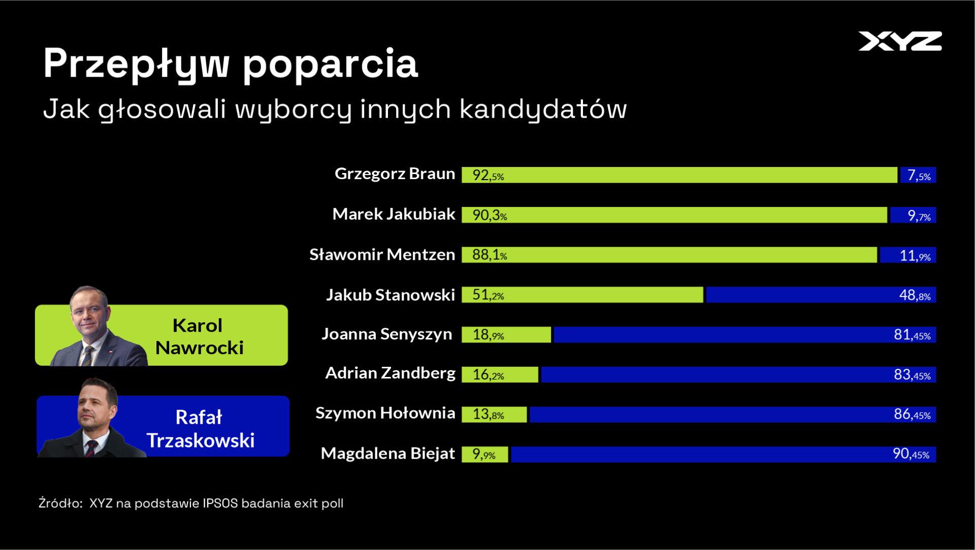 Z wyborców Sławomira Mentzena 88,1 proc. zagłosowało na Karola Nawrockiego. Spośród wyborców Grzegorza Brauna na Nawrockiego zagłosowało 92,5 proc. Z kolei 86,2 proc. wyborców Szymona Hołowni zagłosowało na Rafała Trzaskowskiego. Wyborcy Adriana Zandberga z pierwszej tury w drugiej turze w 83,8 proc. poparli Rafała Trzaskowskiego. Z kolei głosujący 18 maja na Magdalenę Biejat poparli Trzaskowskiego w 90,2 proc. Z wyborców Joanny Senyszyn 81,1 proc. poparło kandydata KO.