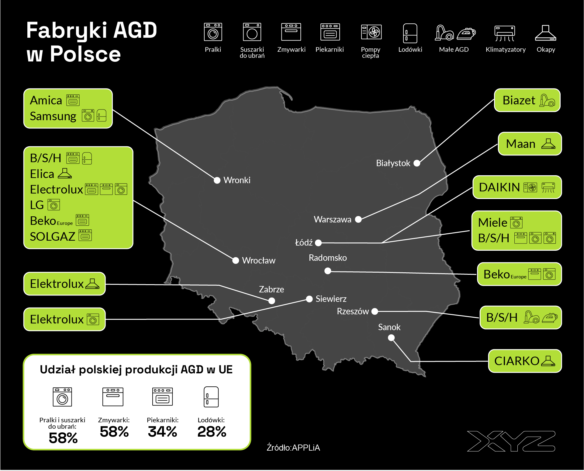 - Branża AGD w Polsce i całej UE traci konkurencyjność: produkcja spada, rośnie udział importu z Azji, a firmy zaczynają ograniczać działalność w Europie lub przenosić ją do tańszych lokalizacji. Polska nadal jest ważnym producentem i eksporterem, ale jej pozycja stopniowo słabnie. Samsung zmniejszy o 30 proc. produkcję we Wronkach. LG zakończyła produkcję lodówek w Kobierzycach. Teka w Hiszpanii została sprzedana Midei, Brandt we Francji został zlikwidowany w grudniu 2025, BSH zamyka dwie fabryki w Niemczech, grupa Arcelik (Beko) zamknęła fabryki w Łodzi i Wrocławiu. Ponadto Gorenje zostało sprzedane chińskiemu Hisense, a Candy chińskiemu koncernowi Haier
