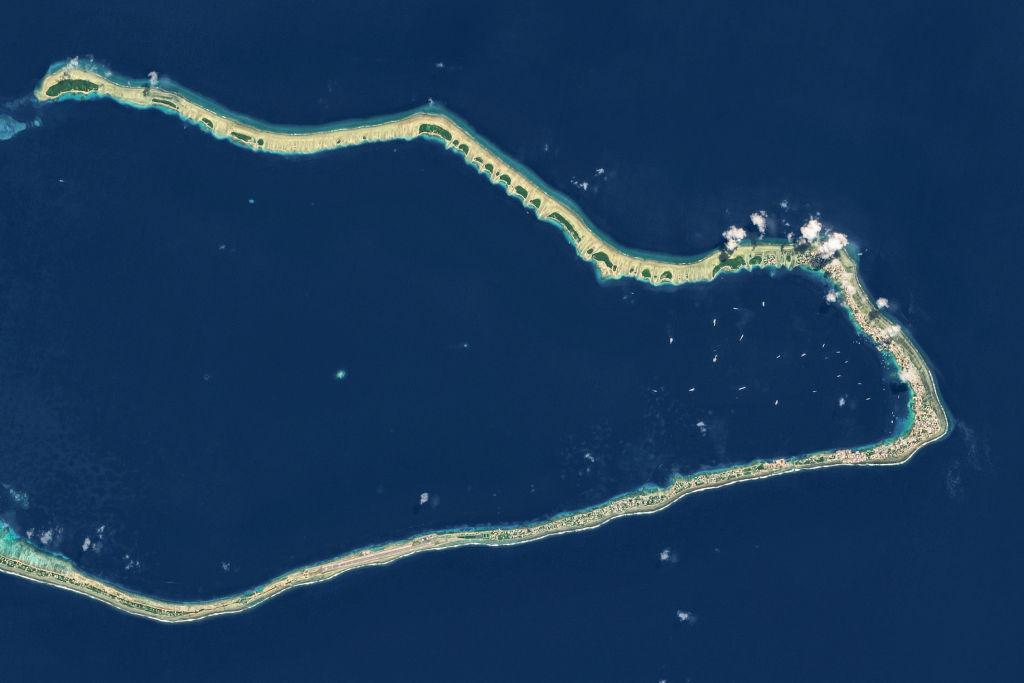 Atol Majuro, na którym położona jest stolica Wysp Marshalla. W niektórych miejscach wyspy są tak wąskie, że można by z powodzeniem przekopać przez nie piłkę. Fot. Gallo Images/Orbital Horizon/Copernicus Sentinel Data 2021